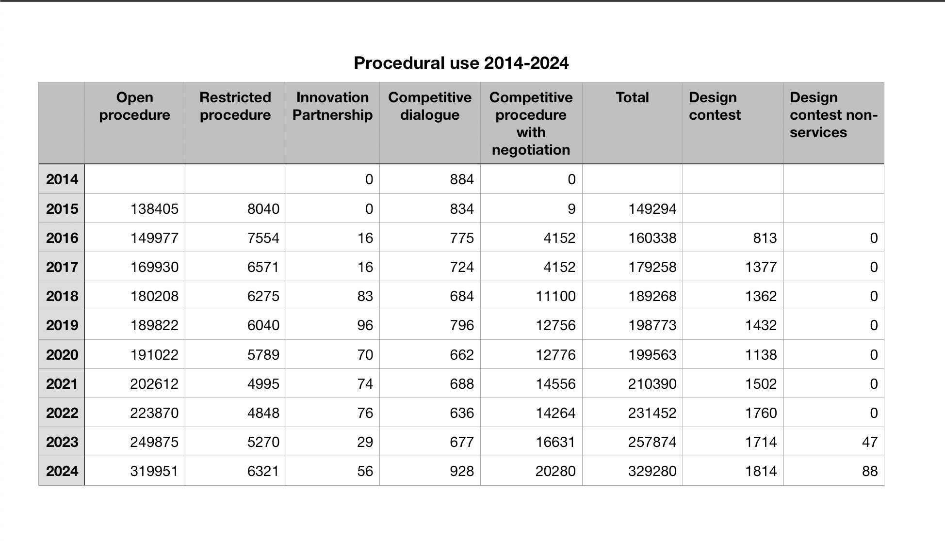 It seems to me that it is possible to extract some conclusions from just this basic dataset: while some procedures are more popular than others, it is evident three procedures are struggling to find traction: restricted, competitive dialogue and innovation partnership.