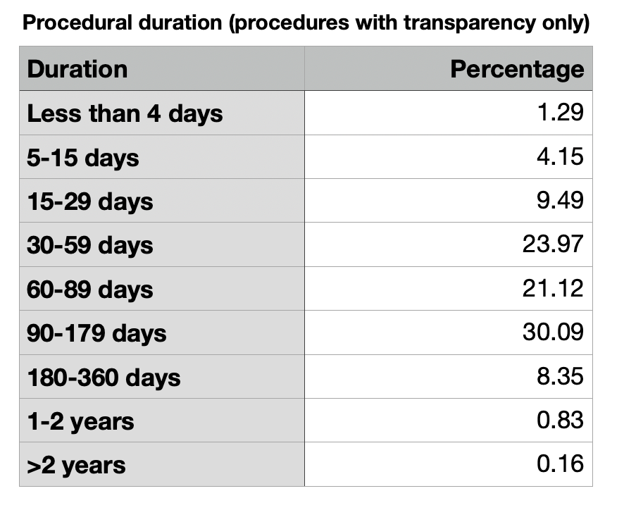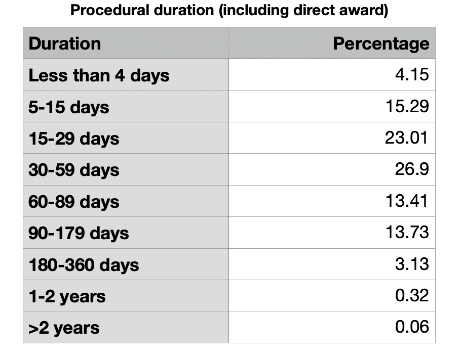 Despite the minister protestations of bureaucracy, the tables on the duration of procedures shows that everything is...mostly fine? It would seem contracts are routinely awarded relatively quickly in Portugal.